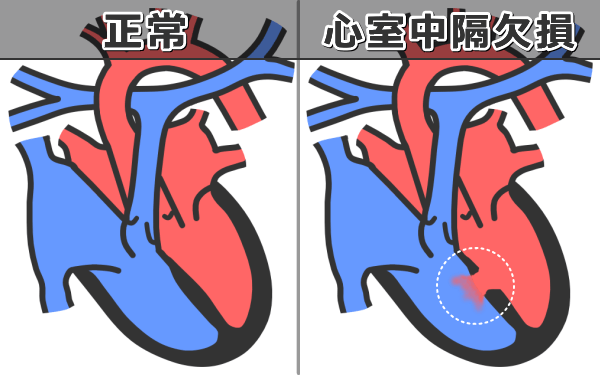 穴が小さい場合ははっきりした症状を見せないこともありますが、穴が大きく、心臓内の血流に悪影響が出ている場合は、生後6ヶ月になる前から症状を示し始め、発育障害なども見られるようになります。症状が出るかどうかの目安は、空いた穴の面積が、上にある大動脈弁の面積の40%以上です。