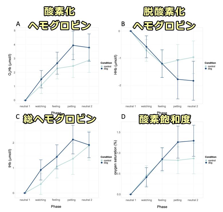 ぬいぐるみよりも犬バージョンの方が0.45μmol/L高かった。この格差は「撫でる」で最大となった。また犬を撫でるフェイズに限ると、飼い主が見えない状況より見える状況の方が総ヘモグロビン濃度が低かった。