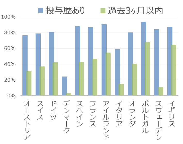 「過去に駆虫薬を使用したか?」という質問に対しては94.1%(ポルトガル)~24.2%(デンマーク)という飼い主からの幅広い回答があり、12ヶ国の中央値は83%でした。また「過去3ヶ月間で駆虫薬を使用したか?」という質問に対する回答は68.0%(ポルトガル)~3.3%(デンマーク)となりました。